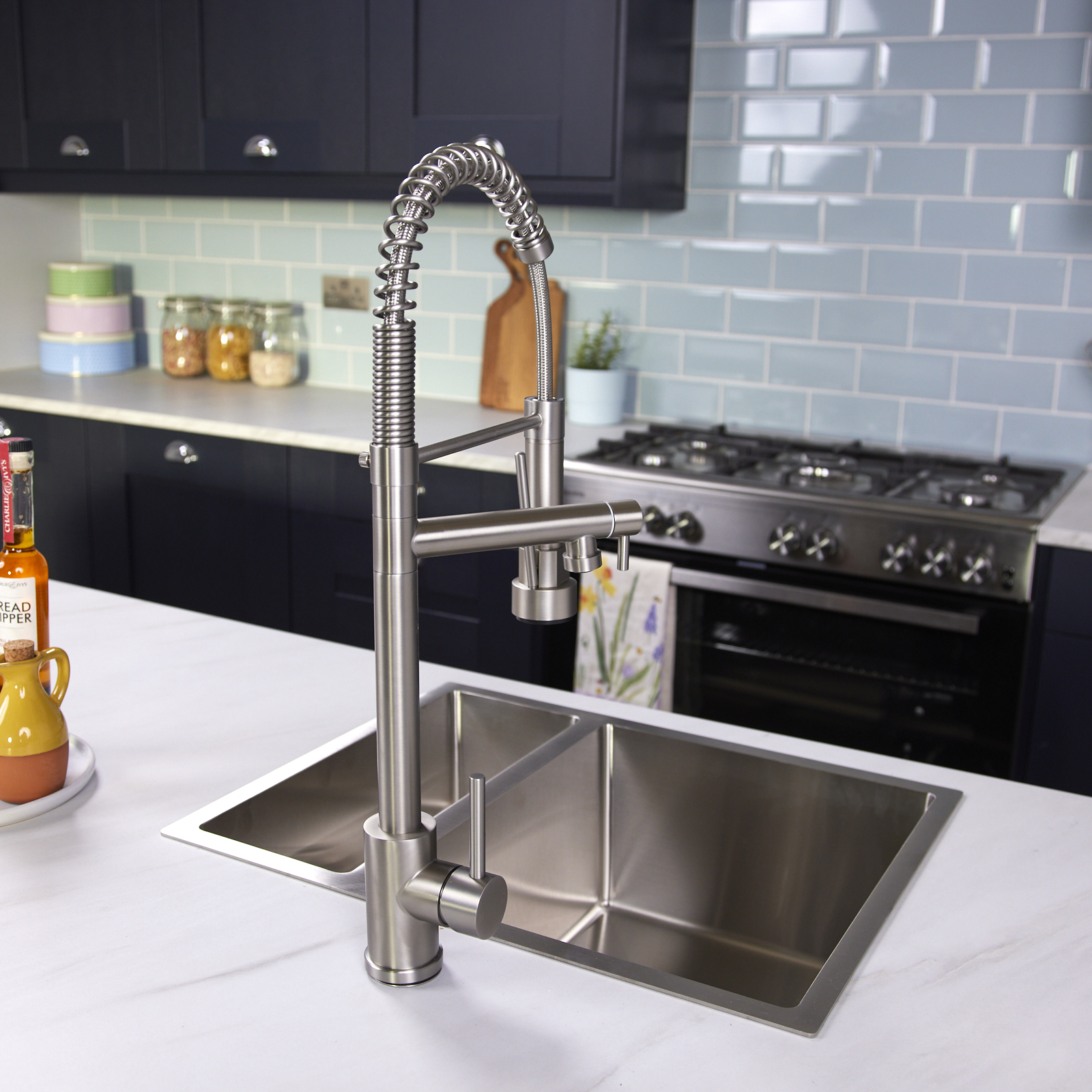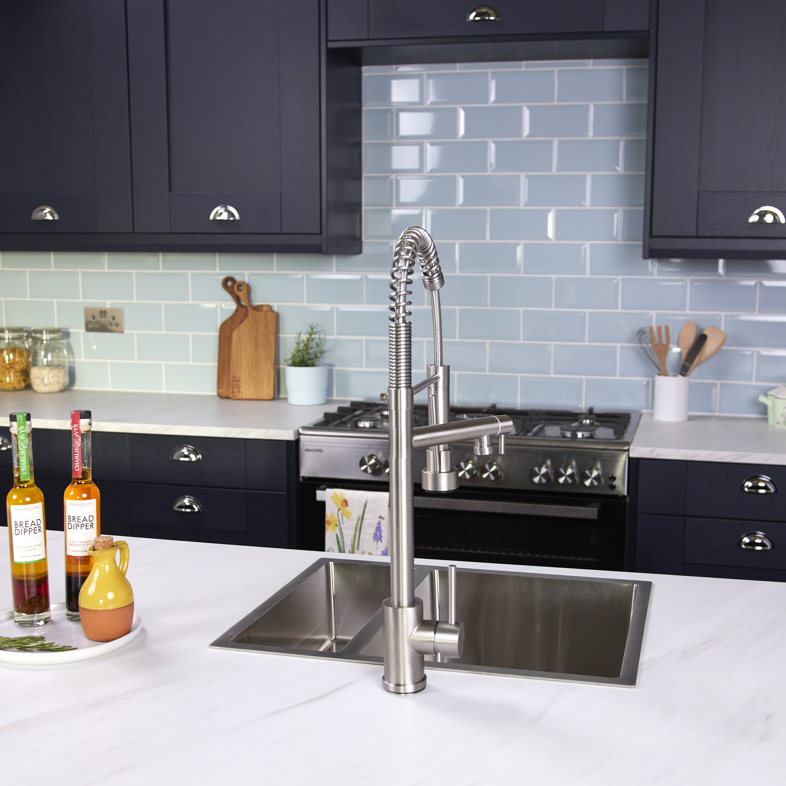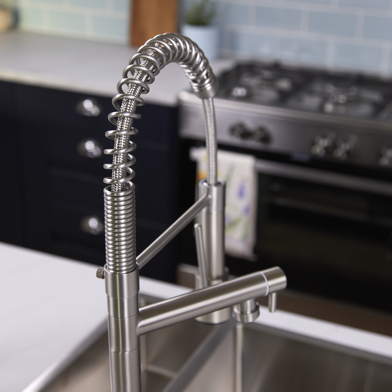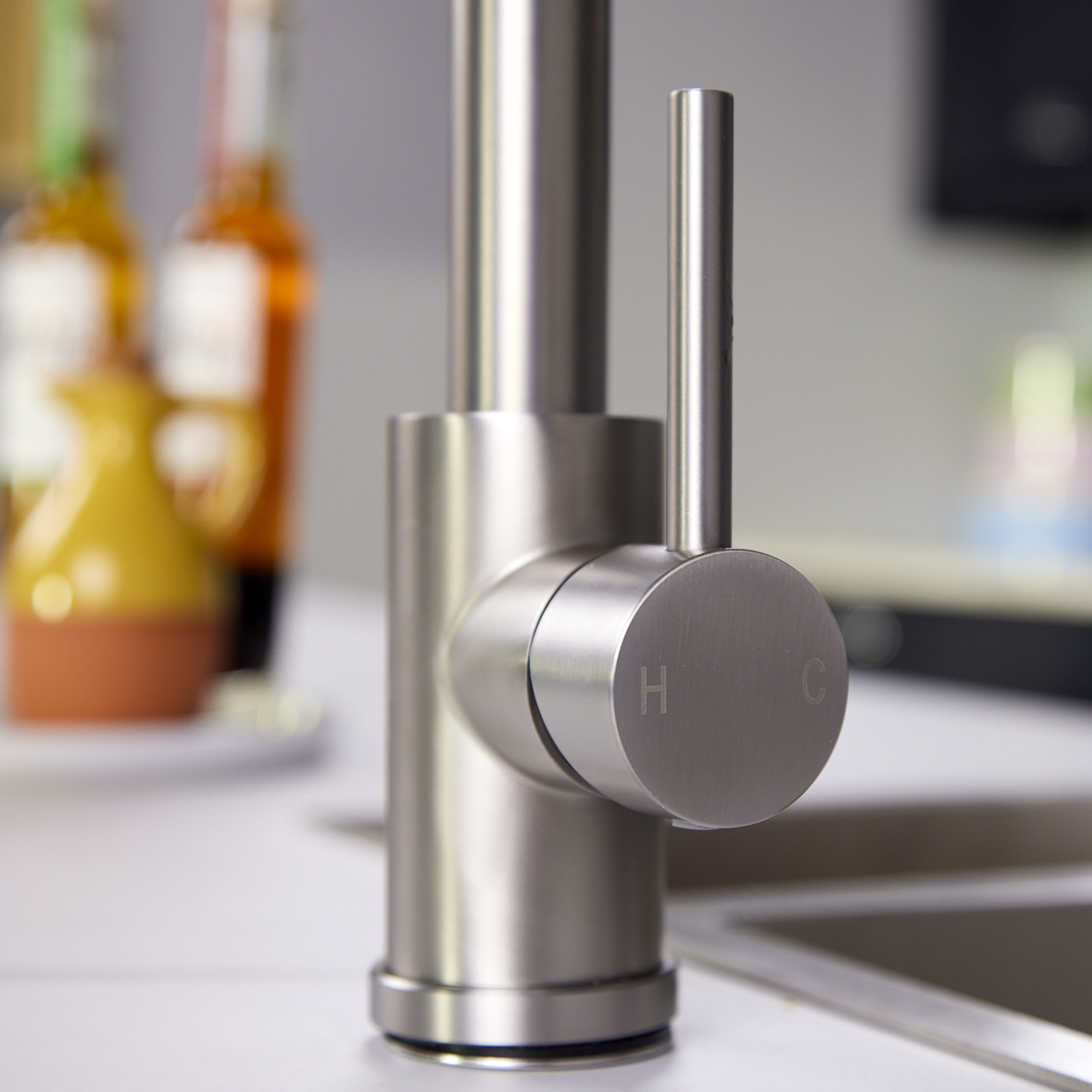 Introducing the Flode Alta single lever kitchen mixer tap. Constructed from stainless steel for long-lasting durability, the Alta features a horizontal swivel spout with an angled spray. Its design also includes a cold water start in the central position, promoting energy efficiency and style all in one tap.
