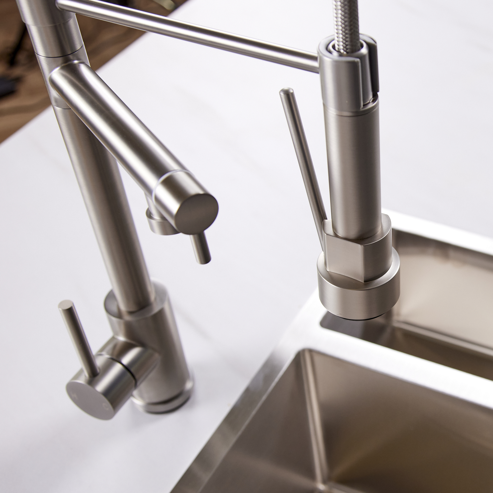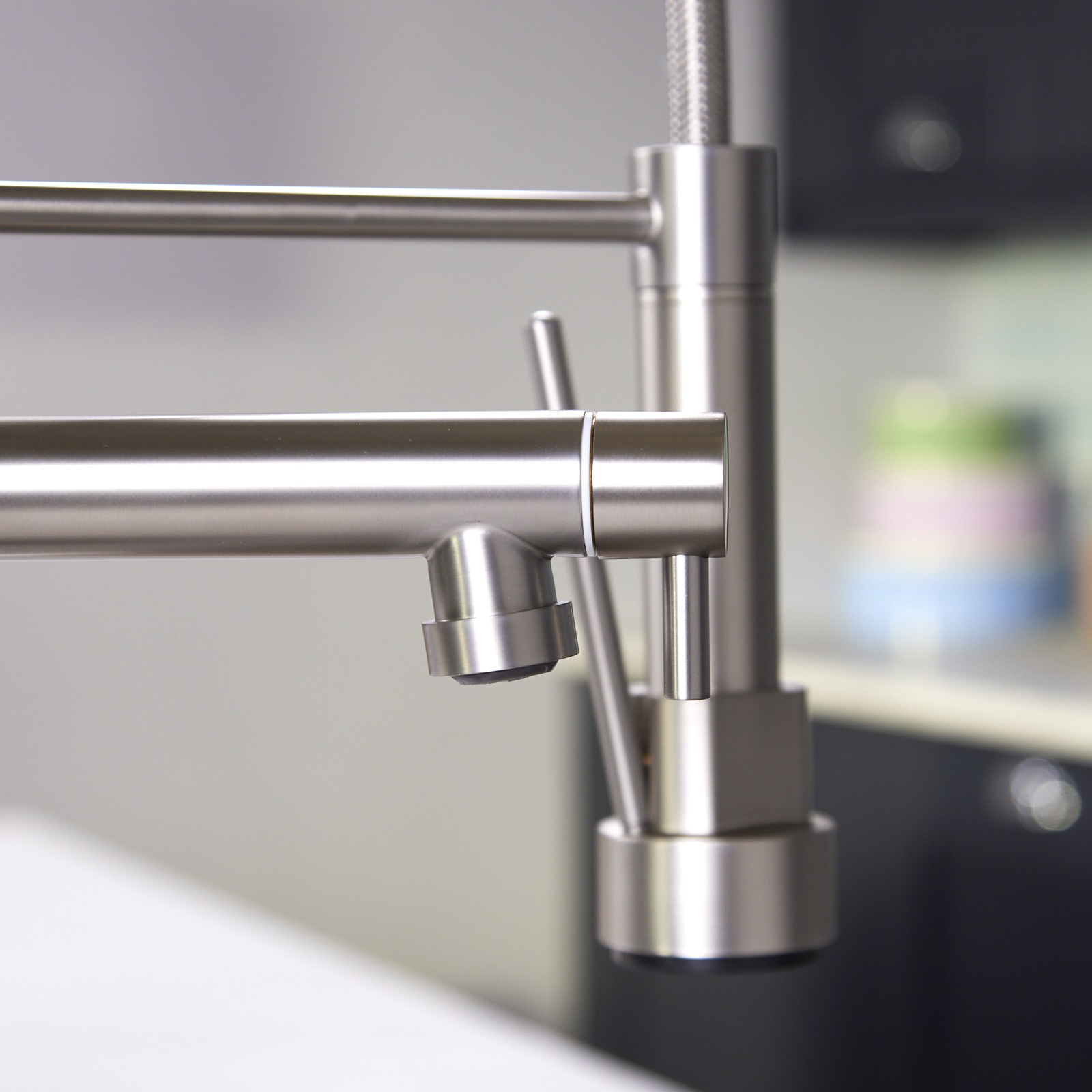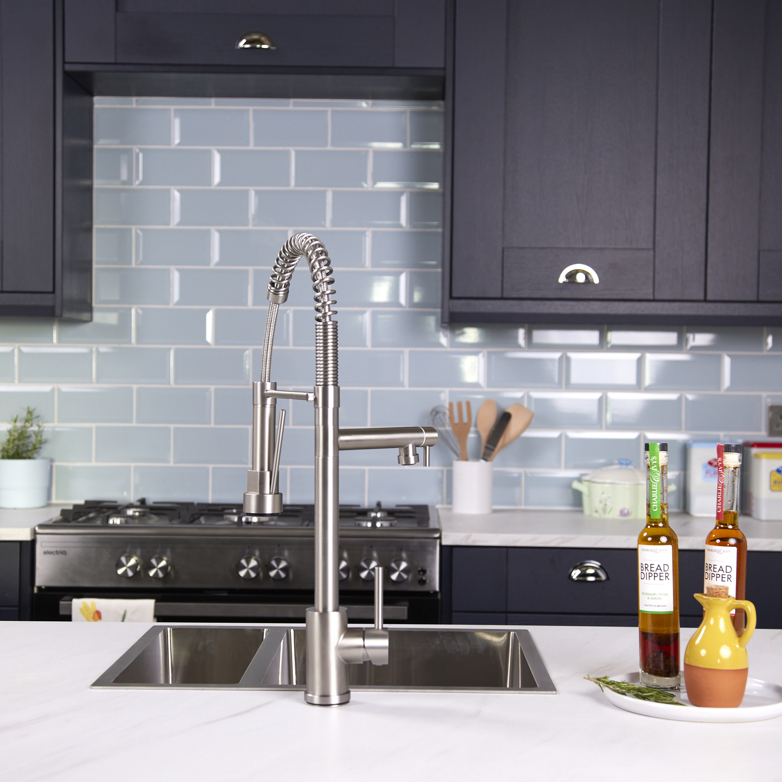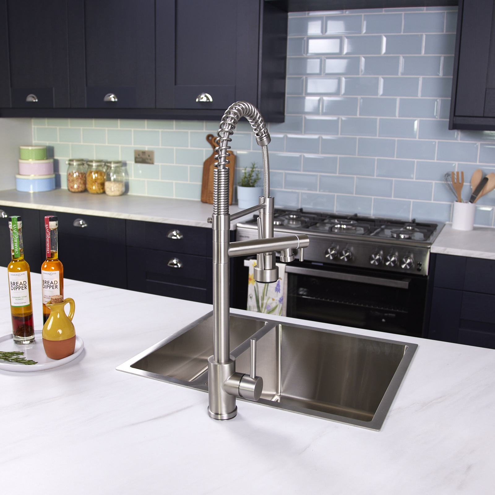 Introducing the Flode Alta single lever kitchen mixer tap. Constructed from stainless steel for long-lasting durability, the Alta features a horizontal swivel spout with an angled spray. Its design also includes a cold water start in the central position, promoting energy efficiency and style all in one tap.