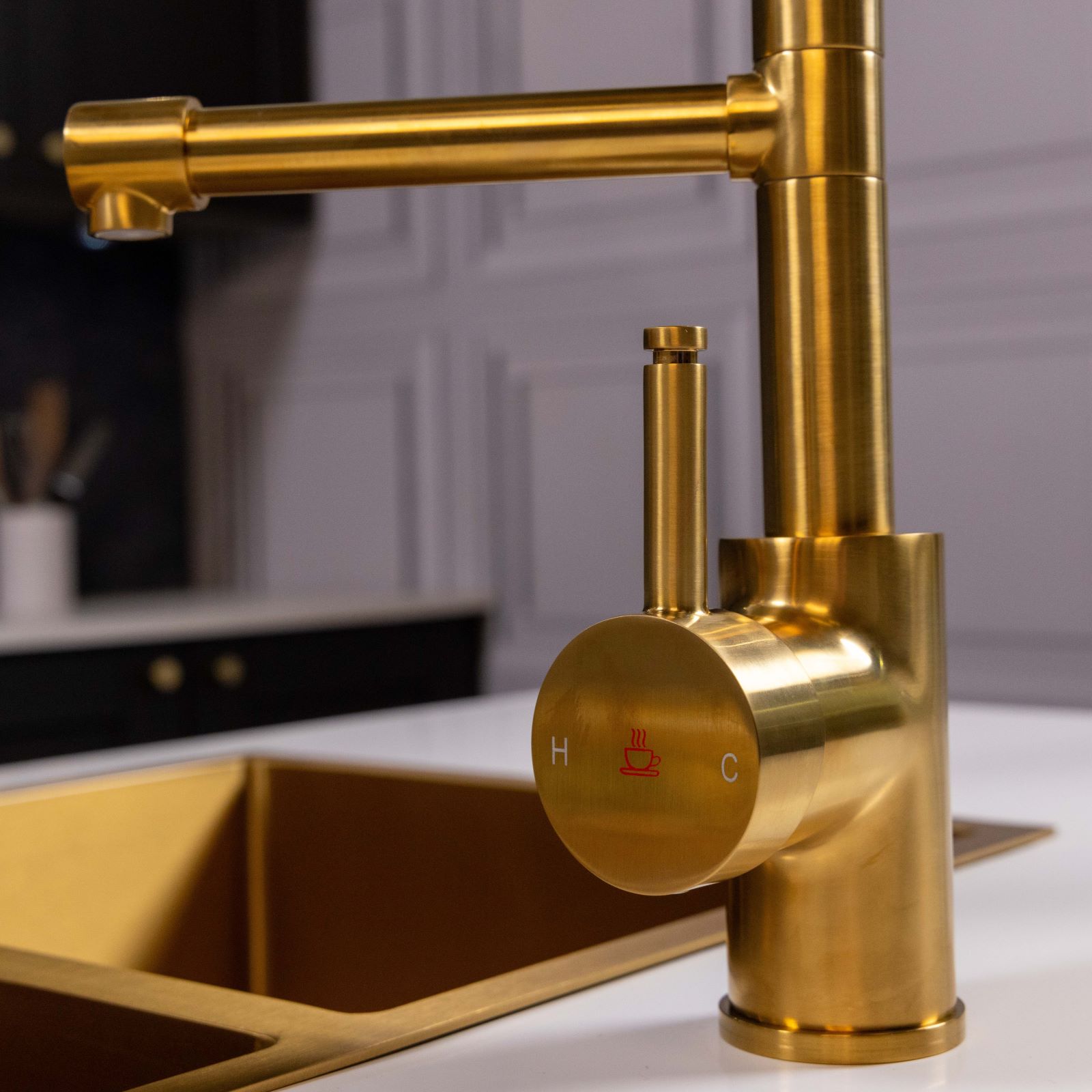 The complete boiling water system comprises a tap, a boiler, and a carbon attraction water filter. The tap features hot and cold mixer levers on the right that regulate the flow and temperature of the water.