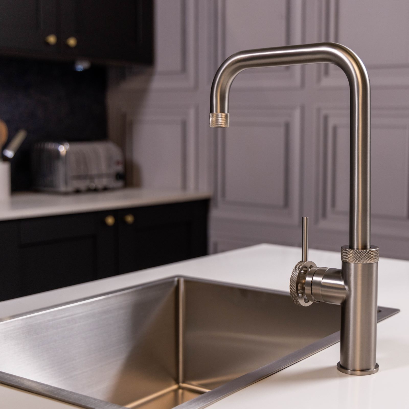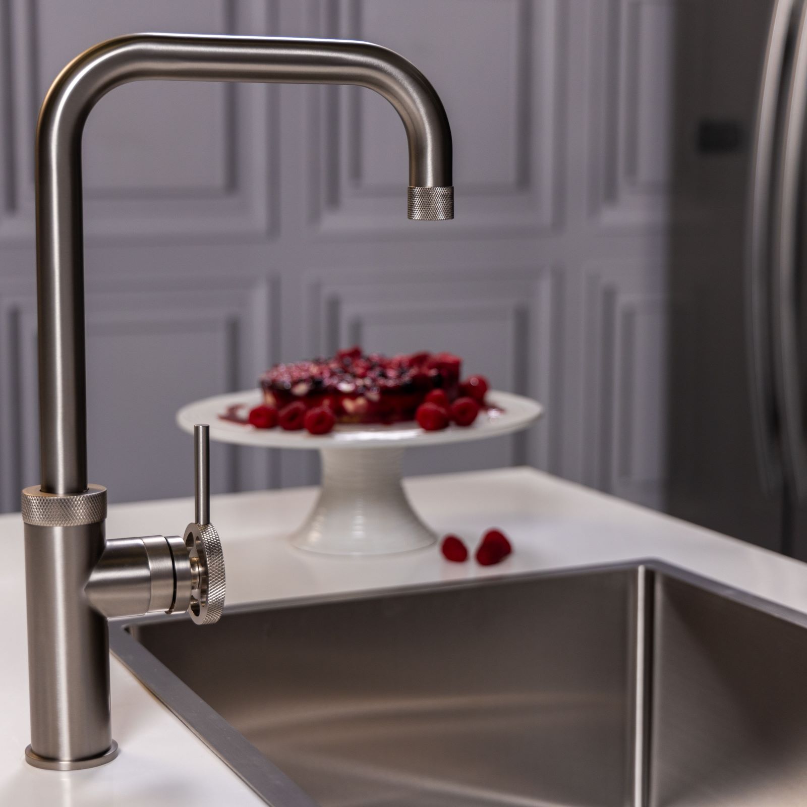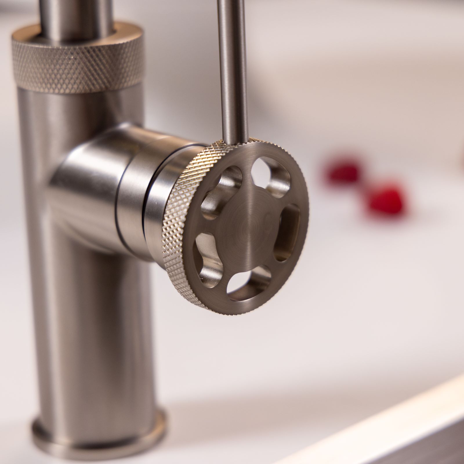 The Flode Hjul Industrial Style Kitchen Tap showcases a sleek and modern design that suits any kitchen setting.