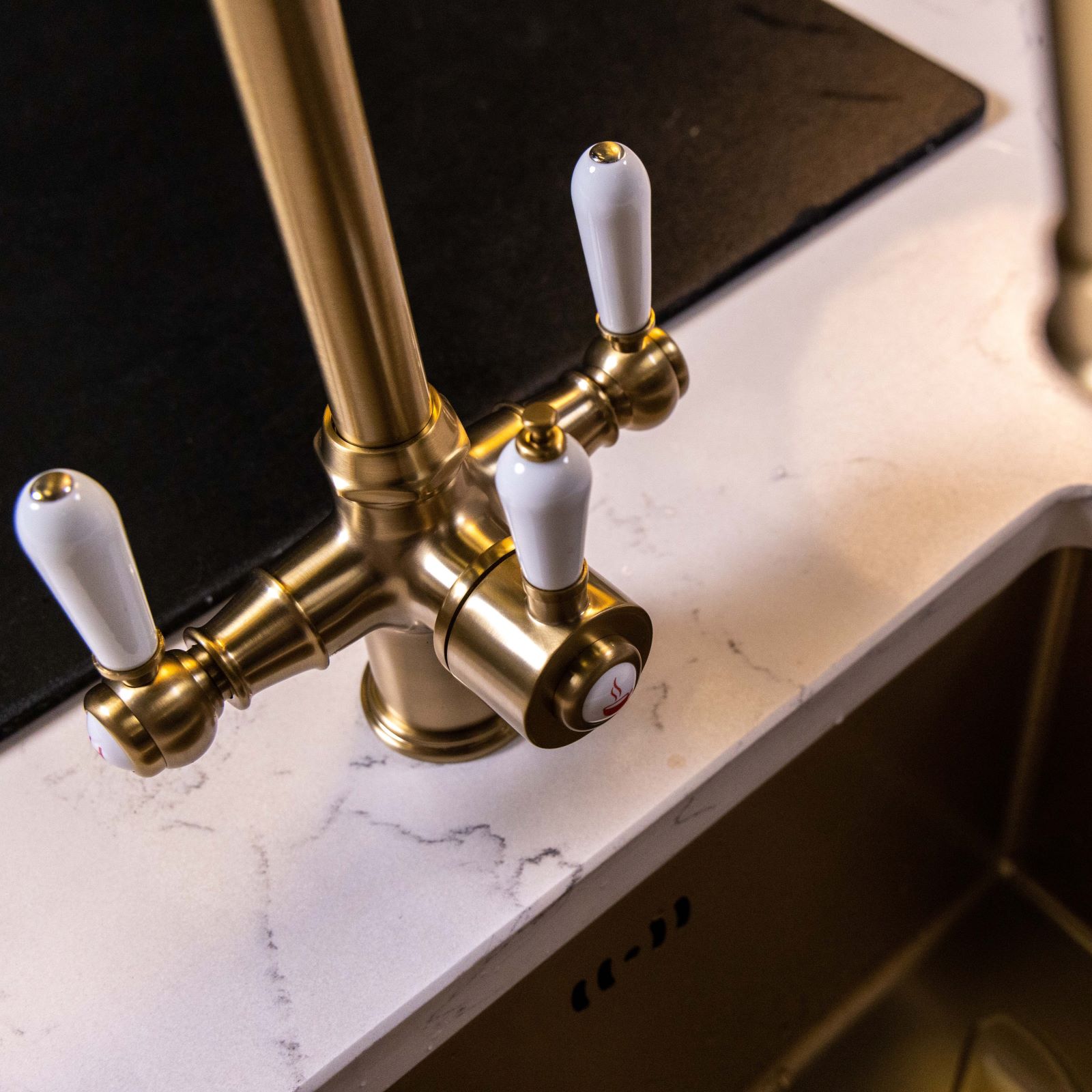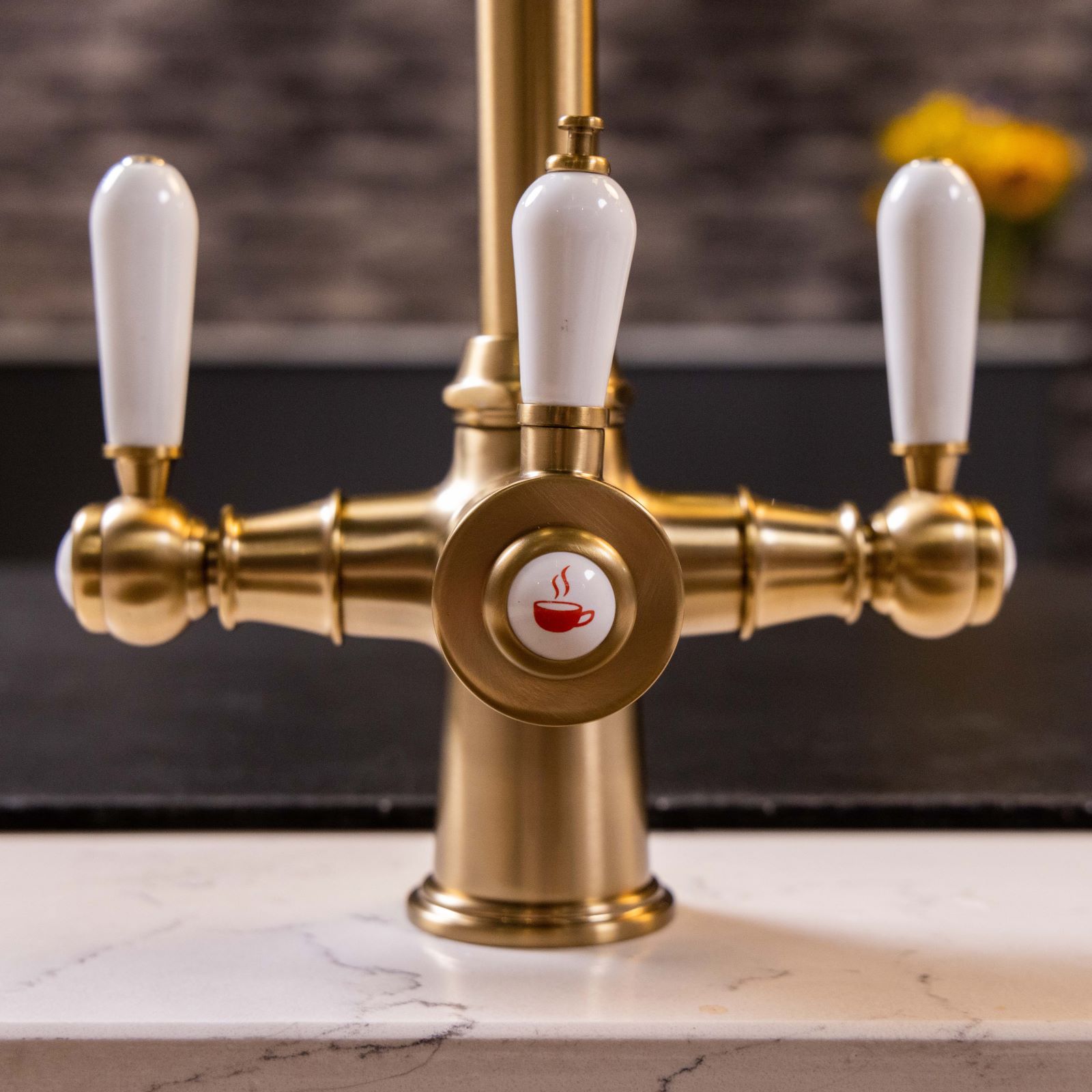 The complete boiling water system comprises a tap, a boiler, and a carbon attraction water filter. The tap features hot and cold mixer levers on the right that regulate the flow and temperature of the water.