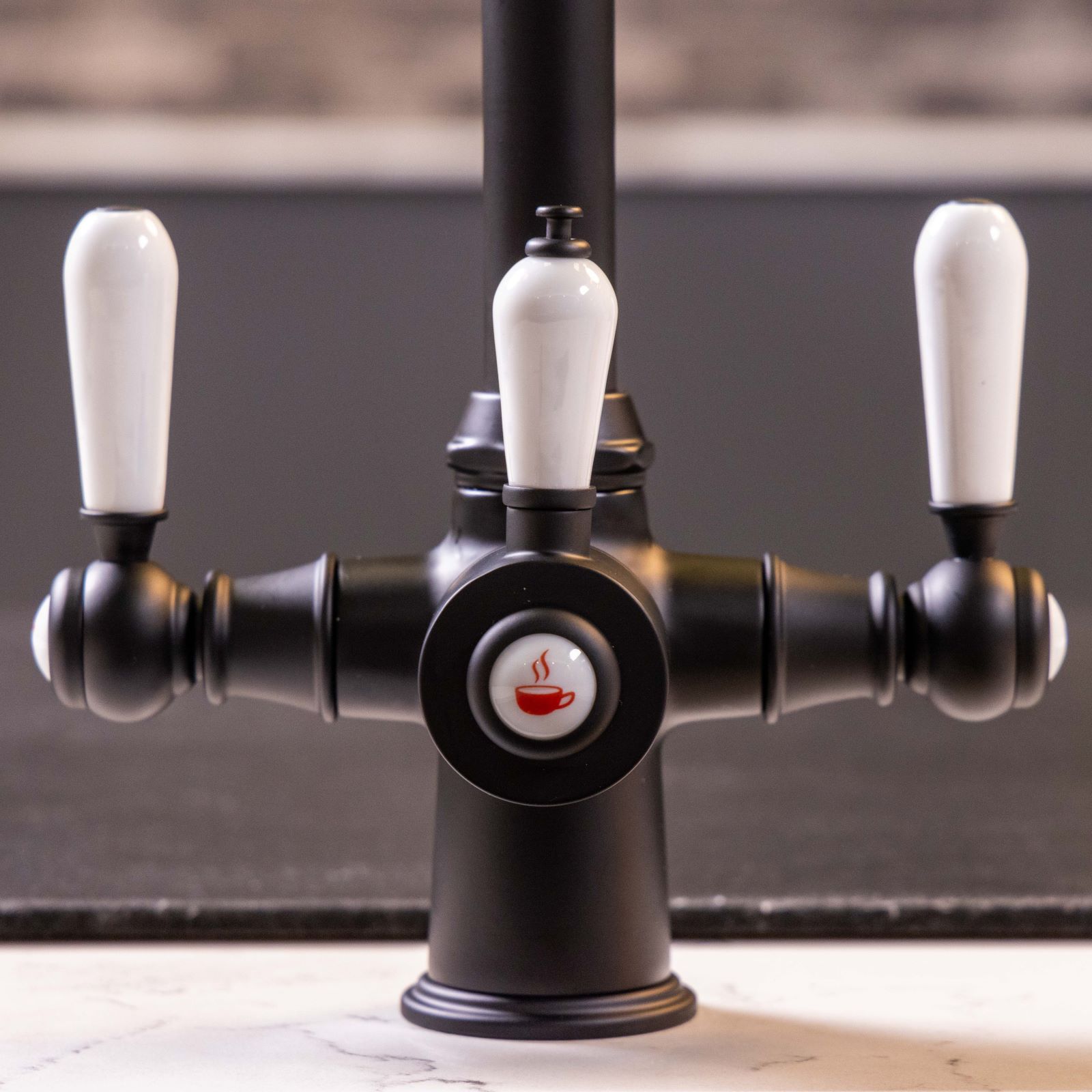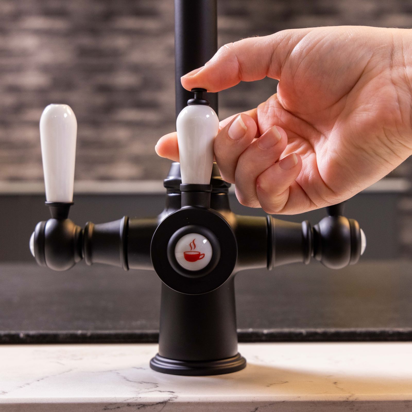 The complete boiling water system comprises a tap, a boiler, and a carbon attraction water filter. The tap features hot and cold mixer levers on the right that regulate the flow and temperature of the water.