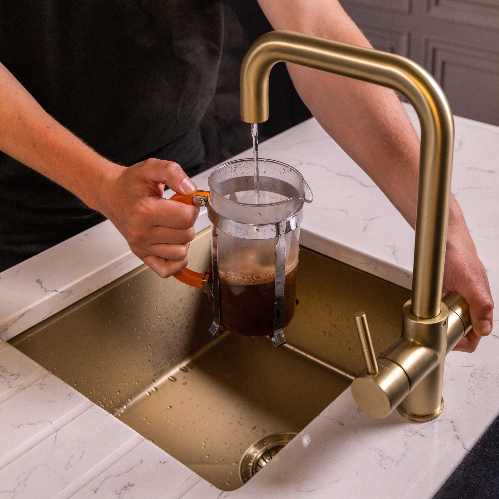 The complete boiling water system comprises a tap, a boiler, chiller unit and a carbon water filter. The tap features hot and cold mixer levers on the right that regulate the flow and temperature of the water.
