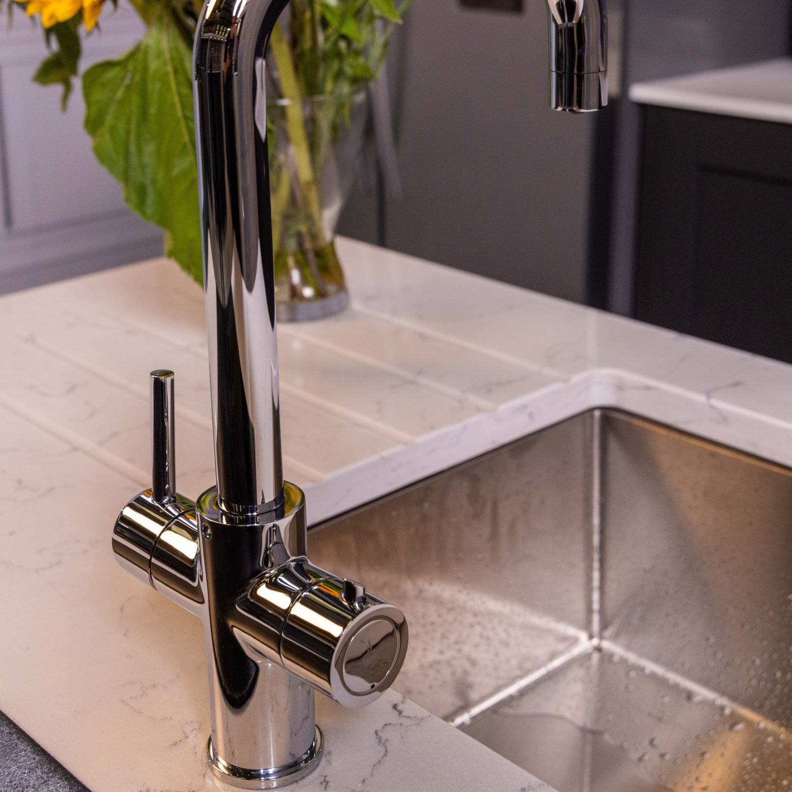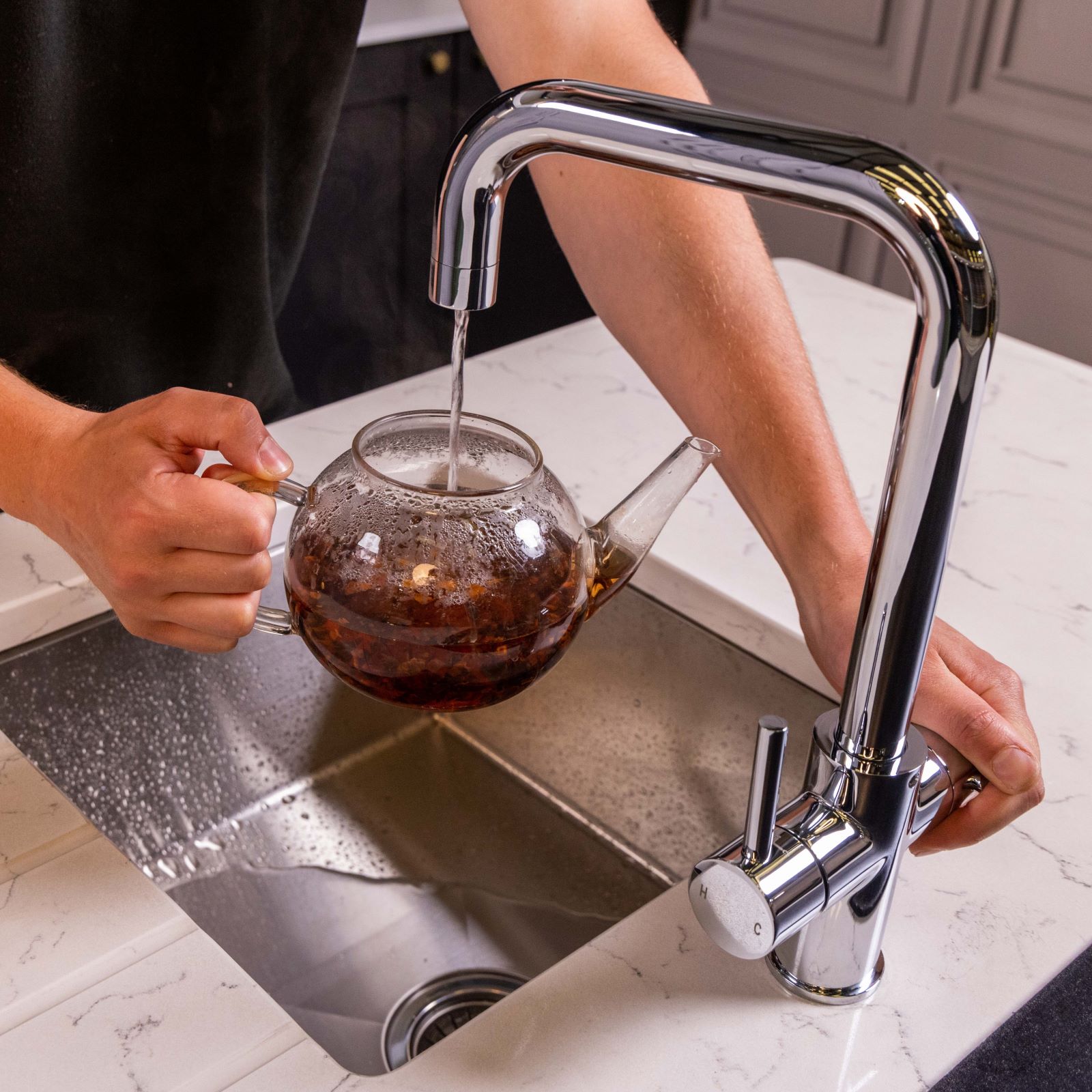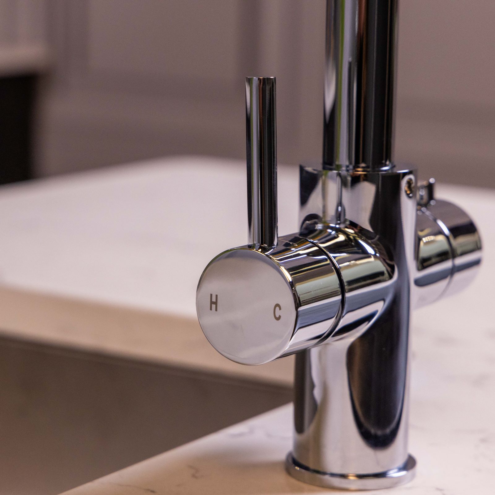 The complete boiling water system comprises a tap, a boiler, chiller unit and a carbon water filter. The tap features hot and cold mixer levers on the right that regulate the flow and temperature of the water.