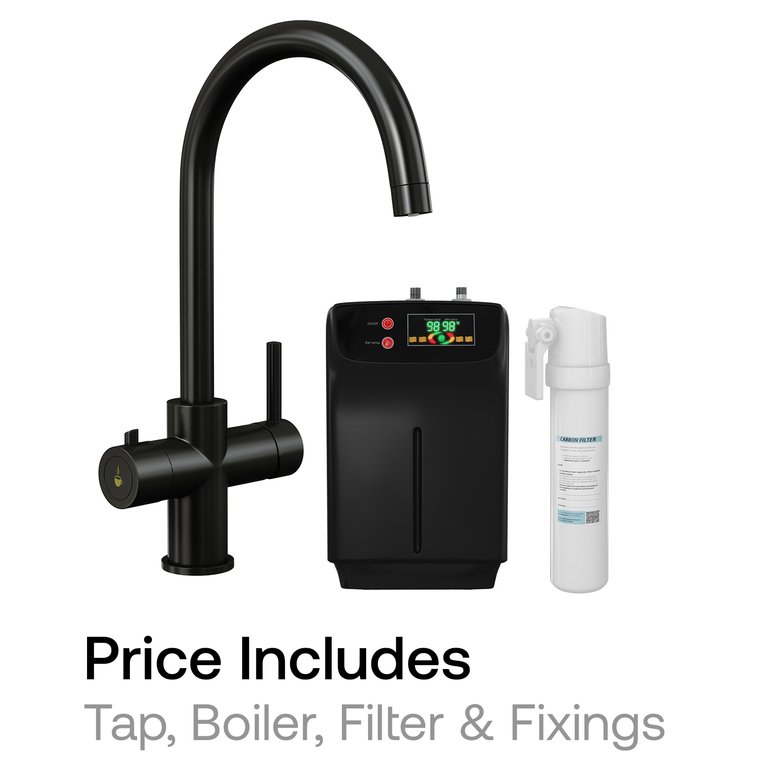 The complete boiling water system comprises a tap, a boiler, and a carbon attraction water filter. The tap features hot and cold mixer levers on the right that regulate the flow and temperature of the water.