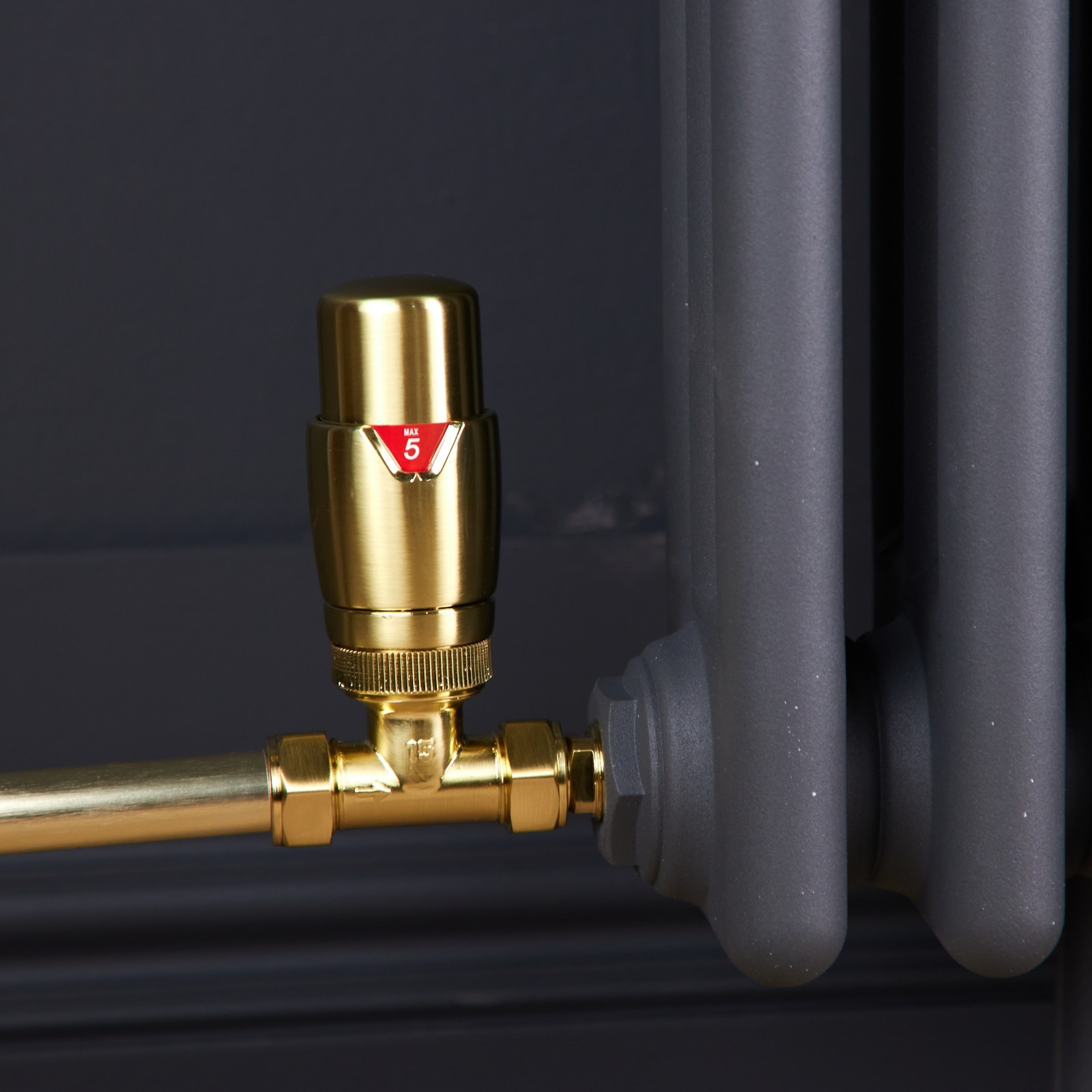 Transform your heating system with the Straight Thermostatic Radiator Valve (TRV) Pack in Brushed Brass, combining timeless style with advanced temperature regulation. The luxurious brushed brass finish adds a sophisticated touch to both modern and traditional radiators, while the thermostatic functionality ensures optimal comfort and energy efficiency.