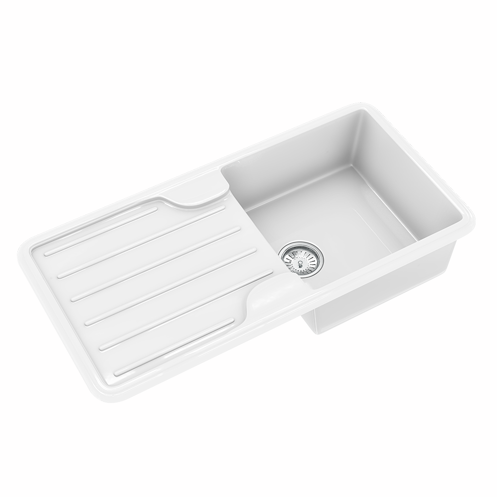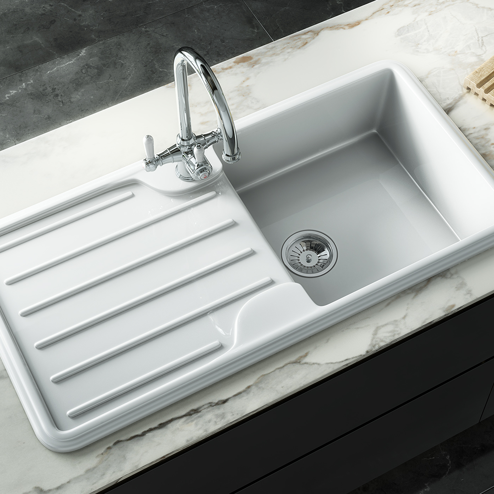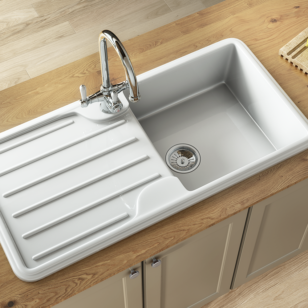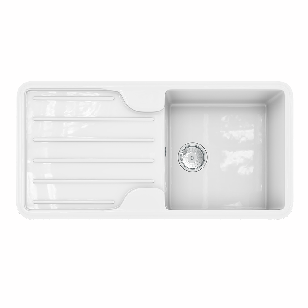 Traditional Gloss White Comite Single Bowl Kitchen Inset Sink & Drainer | 1000 x 500mm | Left or Right Handed | Supplied with Chrome Basket Strainer Waste